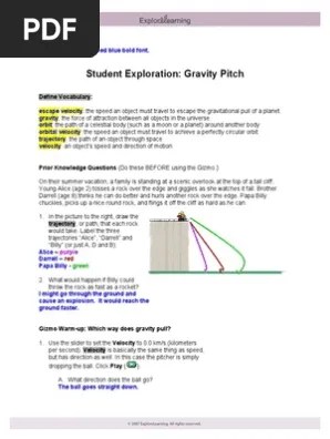 Sign, fax and printable from pc, ipad, tablet or mobile with pdffiller ✓ instantly. • correlations to state and national . Learn vocabulary, terms, and more with. Orbital velocity is the velocity needed to make a circular orbit. Assessment results gravity pitch print page close window. Answer sheet, answer sheet, answer sheet, answer sheet. Learn vocabulary, terms, and more with flashcards, games, and other study tools. 4/5/2019 gravity pitch gizmo : The speed an object must travel to escape the gravitational pull of a planet The smallest velocity needed for the baseball to escape from the planet's gravity and fly off into space is ______. Use the slider to set the velocity to 0.0 km/s (kilometers per second). Which way does gravity pull?